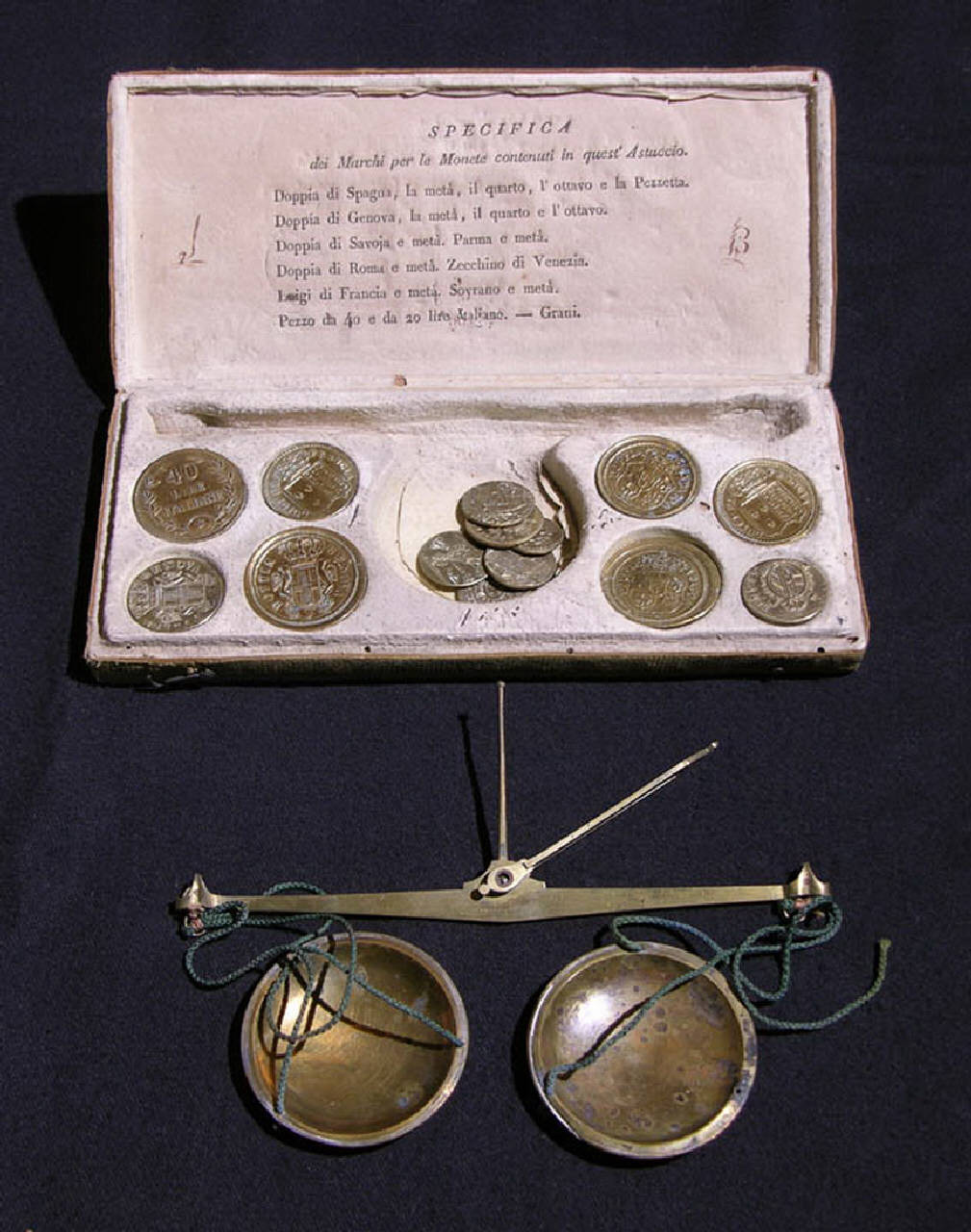 L'oggetto è composto da un astuccio in legno ricoperto di pelle che è chiudibile per mezzo di due piccoli gancini frontali; uno di questi, però, è oggi mancante. Al suo interno è collocata una bilancina a due piatti per la pesatura di monete o piccole quantità di materiale prezioso. I due piattini sono agganciati alle estremità opposte del braccio della bilancia ognuna per mezzo di tre fili di cotone o di seta. La bilancia poteva essere sorretta tenendola per un'astina incernierata nella parte centrale del braccio primario mentre la posizione di equilibrio veniva determinata grazie a una seconda astina solidale al braccio stesso.\nNella parte interna del coperchio della scatola sono elencati i pesi in dotazione. Nell'astuccio sono, infatti, presenti alcuni pesi campione costituiti da esemplari di monete di diversa nazionalità.