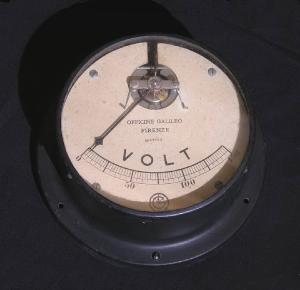 Anche questo strumento di misura, come altri di questa collezione, era destinato alla determinazione della differenza di potenziale esistente tra i capi di un circuito elettrico o tra spezzoni di esso. Ha la forma tipicamente circolare di questo tipo di strumento e il quadrante, che occupa tutta la superficie superiore, è ricoperto e protetto da un vetro. La scala, che è disposta secondo un arco di circonferenza, permetteva di misurare quantità comprese tra 0 e 150 Volt ed è suddivisa con tacche ogni 2,5 unità. La lancetta indicatrice è imperniata nella parte superiore del quadrante.\nLa struttura cilindrica dello strumento, che è metallica, termina dalla parte opposta alla finestra di lettura con una flangia che ne facilitava l'inserimento su un quadro di controllo generale.
