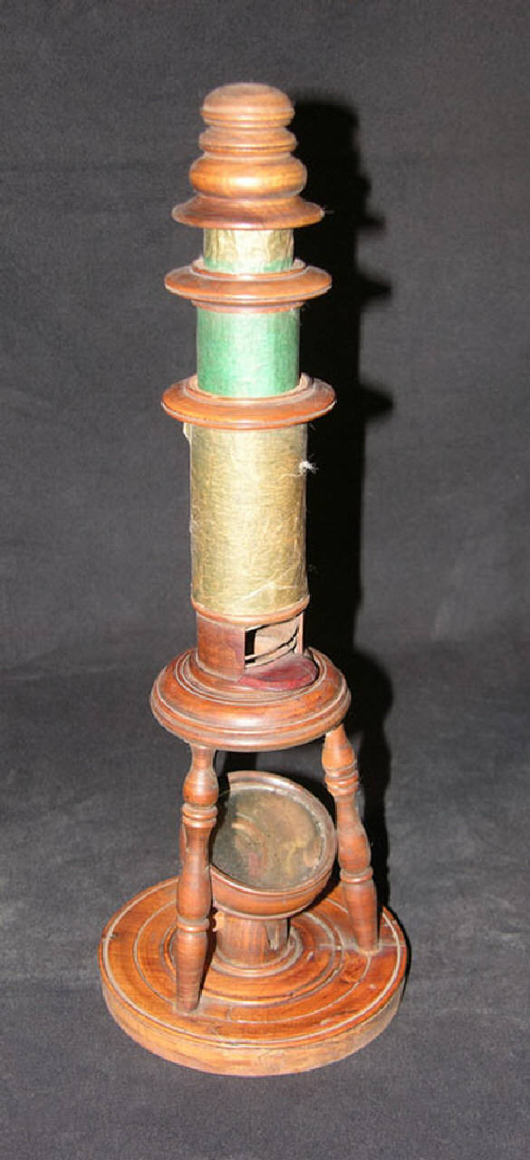 Microscopio di concezione settecentesca formato da un tubo in legno composto da tre parti inserite telescopicamente una dentro all'altra e libere di scorrere; in questo modo si può variare la lunghezza totale del tubo stesso e quindi regolare la messa a fuoco. Il tubo è posizionato verticalmente e tenuto in posizione da tre piccole colonnine lavorate e leggermente divaricanti che terminano su una base di appoggio a sezione circolare. Al centro di questa base è collocato un piccolo supporto orientabile che sorregge uno specchietto per la riflessione della luce verso l'obiettivo del microscopio.\nSotto alla base è incollato un pezzo di carta con scritto LS. Inoltre vi è una scritta a mano fatta con inchiostro nero e calligrafia tipicamente del XVIII secolo che parrebbe essere 1765. LS dovrebbe stare per Lazzaro Spallanzani.