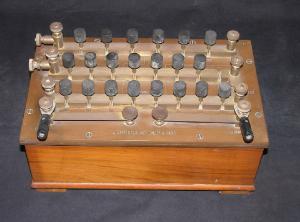 Ponte di Wheatstone. E' in pratica una scatola di resistenze campione di tipica concezione ottocentesca. E' formata da una scatola in legno di forma rettangolare parallelepipeda poggiante su quattro piedini e chiusa in alto da una base in bachelite. Sulla parte superiore sono posizionati i tracciati conduttori - realizzati per mezzo di sbarrette in ottone - sui quali sono ricavate le sedi utilizzate per impostare i valori desiderati. Questa operazione veniva compiuta con l'ausilio di piccole spine metalliche (con manopola isolante) opportunamente posizionate. Sono, inoltre, presenti otto morsetti in ottone per i collegamenti elettrici e due interruttori a leva elastica.