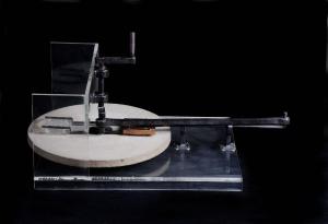Il modello è costituito da un disco abrasivo montato su una struttura in plexiglass. Il disco ruota su un albero di tramissione verticale azionato da una manovella. Sullo stesso albero è montato un sistema biella-manovella. Alla biella è collegato un braccio, che scorre sul disco abrasivo, recando una tavola in legno e una in plexiglass