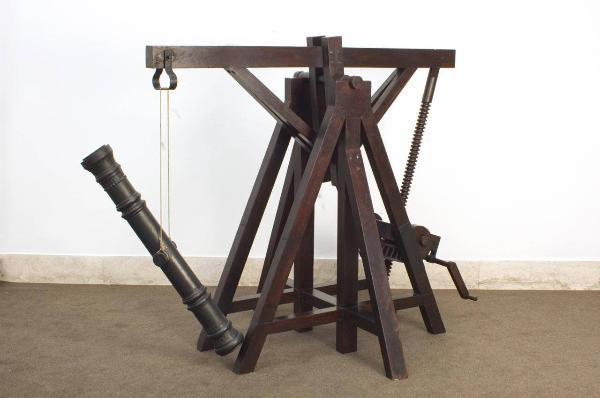 La struttura dell'argano è a classica forma di "capra". Nella parte superiore un braccio a bilancere bascula su un perno: un'estremità è collegata a una vite senza fine, mentre l'altra sorregge una bombarda legata con delle corde.