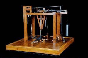 Il maglio è costituito da un cuneo metallico sostenuto attraverso due guide a una struttura di legno. Sotto il maglio vi è una lamina metallica collegata a due corde a sua volta collegate a un sistema di pulegge e ruote dentate che ne comandano l'avanzamento. Sia il sistema di azionamento del maglio ( che avviene tramite un albero di trasmissione e ruota a camme) che il trascinamento della lamina è comandato da pesi di ferro.