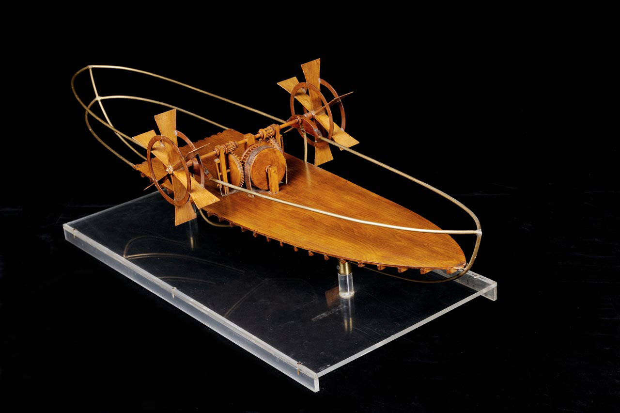 Il modello rappresenta la parte centrale di uno scafo di imbarcazione, fornito di due grandi ruote a pale. Sul ponte della barca c'è un tamburo, collegato al ponte inferiore da una cinghia di cuoio. il tamburo ingrana due ruote dentate collegate a due pignoni posi sull'albero motore delle ruote a pale. Il resto dello scafo dell'imbarcazione è ricostruito con una profilatura in ottone.
