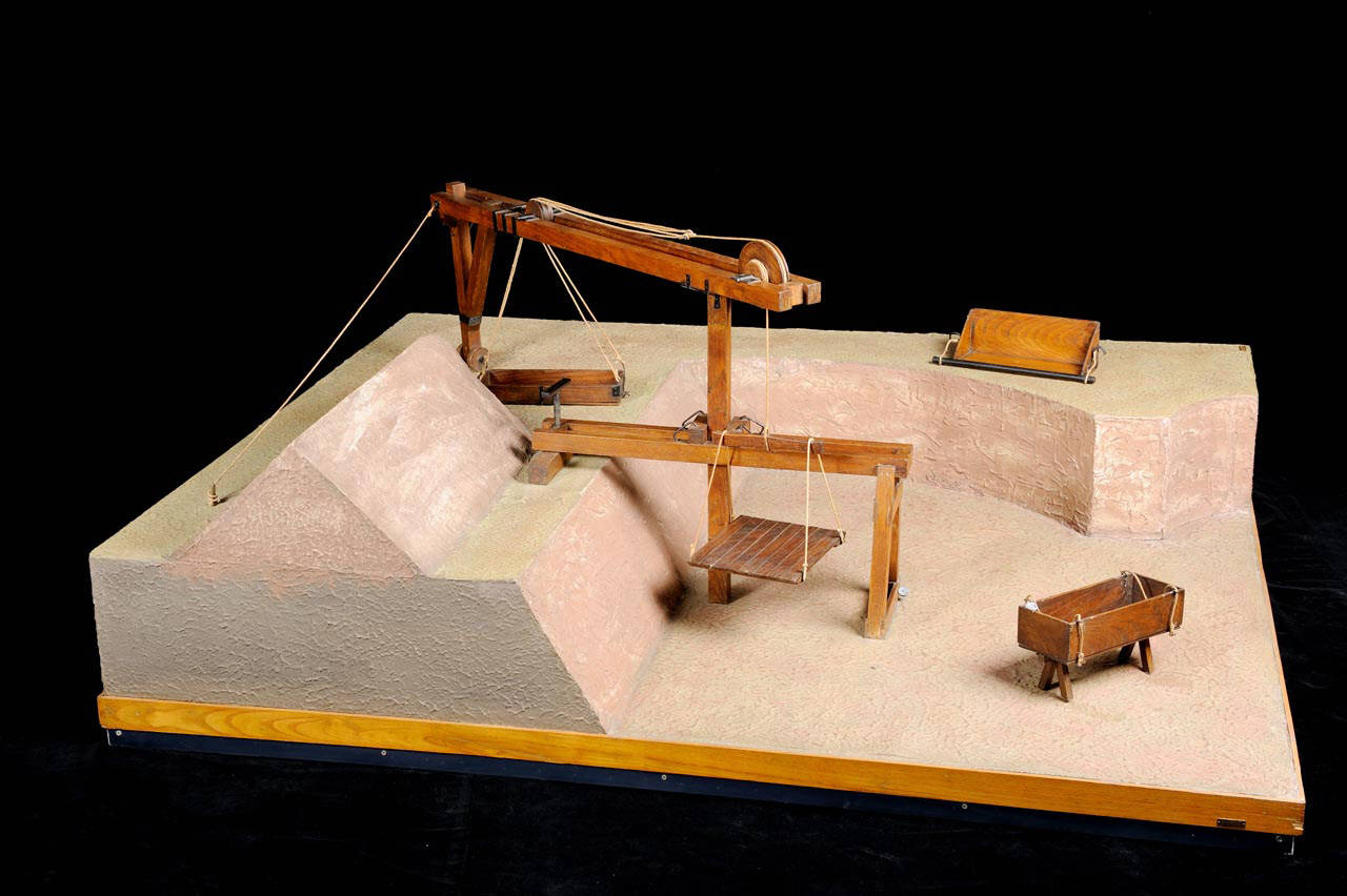 Il modello rappresenta una gru a due bracci rotante su un albero. L'estremità di un braccio poggia sul livello superiore del terreno, aiutato da una ruota. L'albero principale è rinforzato da un'armatura di sostegno. Due carrucole muovono il sitema di corde alle cui estremità sono collocati una base di legno e una cassa a fondo apribile.