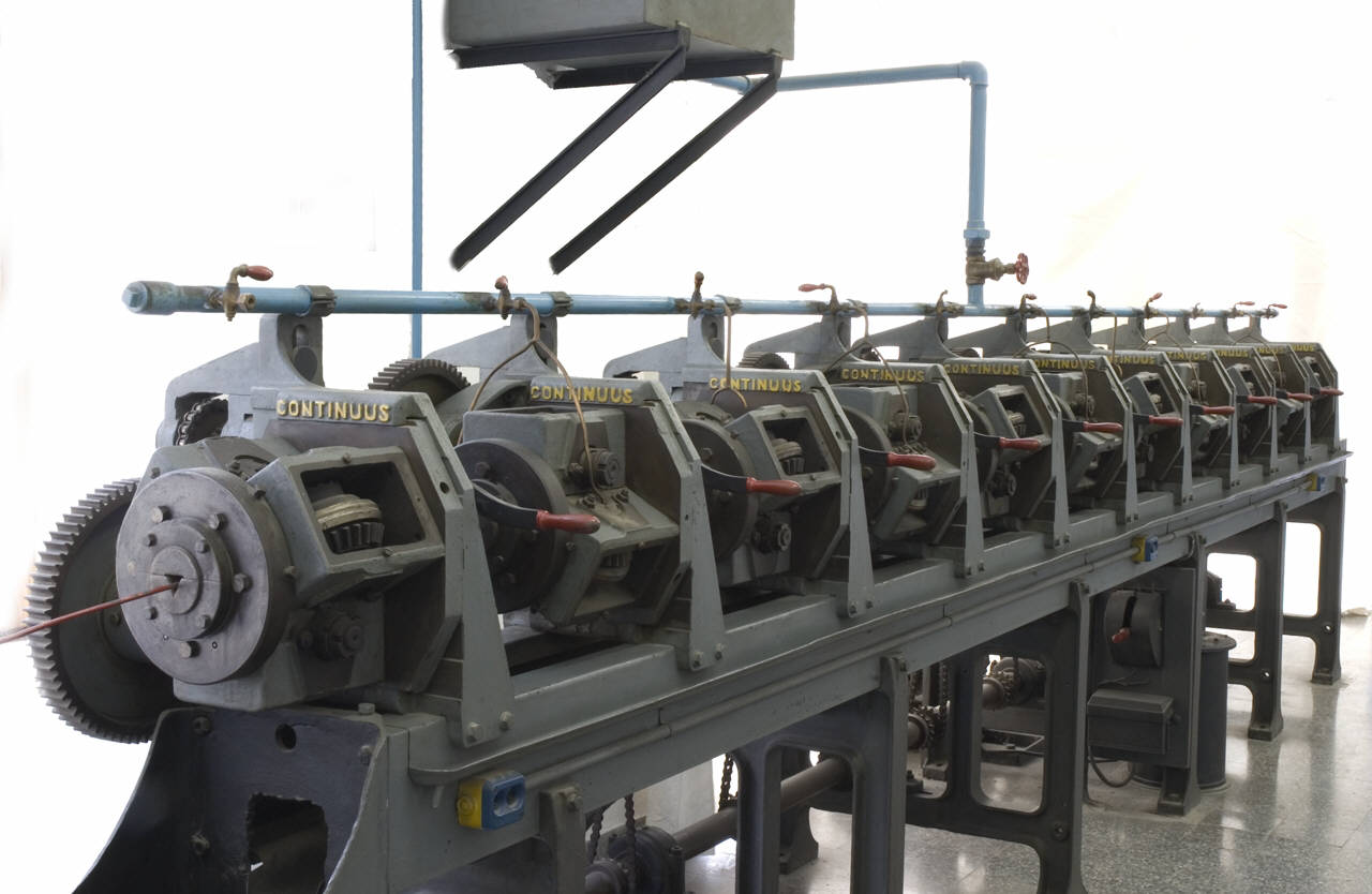 Laminatoio, seconda parte del "Sistema CCR" (Continuous Casting and Rolling - Colata continua in conchiglia chiusa e laminazione diretta). La macchina è composta da 11 gabbie di laminazione a trio in linea, un sistema di raffreddamento ad acqua e un motore elettrico con reostato.\nIn ogni gabbia, i tre cilindri sono montati a 120° l'uno rispetto all'altro (90-210-330 o 30-150-270 a gabbie alterne), in modo da garantire l'ottenimento di una barra a sezione triangolare ed esagonale nelle prime gabbie e di una vergella a sezione triangolare e circolare nelle ultime. Grazie alla posizione dei cilindri, la deformazione del metallo avviene sempre in direzione longitudinale ed elimina le imperfezioni sempre riscontrabili in prodotti ottenuti tramite laminatoi a duo. Il sistema di lubrificazione a getto di emulsione scorre lungo tutta la parte superiore del laminatoio, mentre una vasca per il recupero dell'emulsione scorre lungo tutta la parte inferiore. Le parti suscettibili a movimentazione manuale (manopole) sono colorate di rosso, secondo quanto indicato dalla regolamentazione dell'epoca.\nCorredano la macchina un motore elettrico, un reostato e un serbatoio atto a contenere l'emulsione del sistema lubrificante. Il motore e il reostato sono posizionati in modo da poter fornire il movimento di rotazione ai cilindri mediante alberi, allunghe, giunti e snodi. Le parti suscettibili a movimentazione manuale (manopole e volanti) sono colorate di rosso, secondo quanto indicato dalla regolamentazione dell'epoca.
