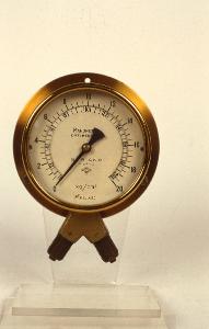 Strumento di forma circolare dotato di flangia per il fissaggio ad un quadro di controllo e dotato di scala graduata circolare con valori compresi tra 0 e 20 Kg/cm2, con tacche ogni 0.5 unità e indicazioni numeriche ogni 2. Concentrica alla scala principale è presente una scala identica alla prima ma libera di ruotare rispetto a quest'ultima consentendo la misurazione della differenza di pressione nel tratto di impianto da misurare. Nella parte sottostante dello strumento sono presenti due connettori per l'inserimento nell'impianto. Lo strumento è collocato su una base in plastica trasparente a soli fini espositivi.