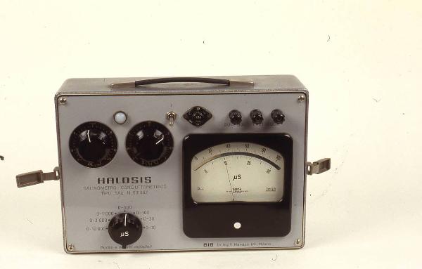 Lo strumento di formna rettangolare era originariamente dotato di coperchio attualmente mancante. La parte superiore è completamente occupata dal quadro di controllo e regolazione. Su di esso sono presenti tre manopole per l'impostazione della scala di lettura e la regolazione di alcuni parametri, l'interruttore di accensione e spegnimento, tre morsetti per le connessioni elettiche, un porta fusibile, una spia di funzionamnto e lo strumento di misura vero e proprio. Questo ha forma rettangolare ed è dotato di due scale di lettura semicircolari concentriche: quella più esterna per letture comprese tra 0 e 100 microsiemens con indicazioni numeriche ogni 20 e suddivisioni ogni 2 unità, quella interna consentiva letture per valori compresi tra 0 e 30 microsiemens con indicazioni numeriche ogni 10 e suddivisioni ogni 0,5 unità. Il vetro a protezione della scala di lettura è rotto. Tra le due scale è collocata una lamina metallica riflettente per la correzione dell'effetto di parallasse in lettura. Sul quadro sono incise, oltre ad alcune indicazioni funzionali, anche il nome dello strumento e il nome della ditta produttrice. Sul lato destro è posizionata la presa per il collegamento all'alimentazione elettrica.