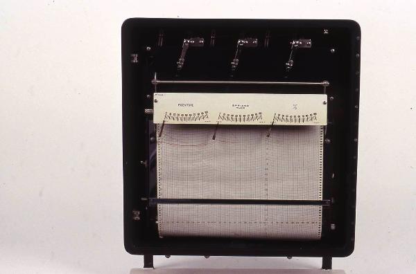 Lo strumento è costituto da una cassa metallica di forma quadrata chiusa da un coperchio attualmente mancante. All'interno sono presenti tre registratori a inchiostro che riportano la lettura su una scala millimetrata messa in movimento da un meccanismo orario. Per ognuno dei tre indicatori è presente anche la scala per la lettura visuale. Lo strumento è posizionato su un supporto metallico a soli scopi espositivi.