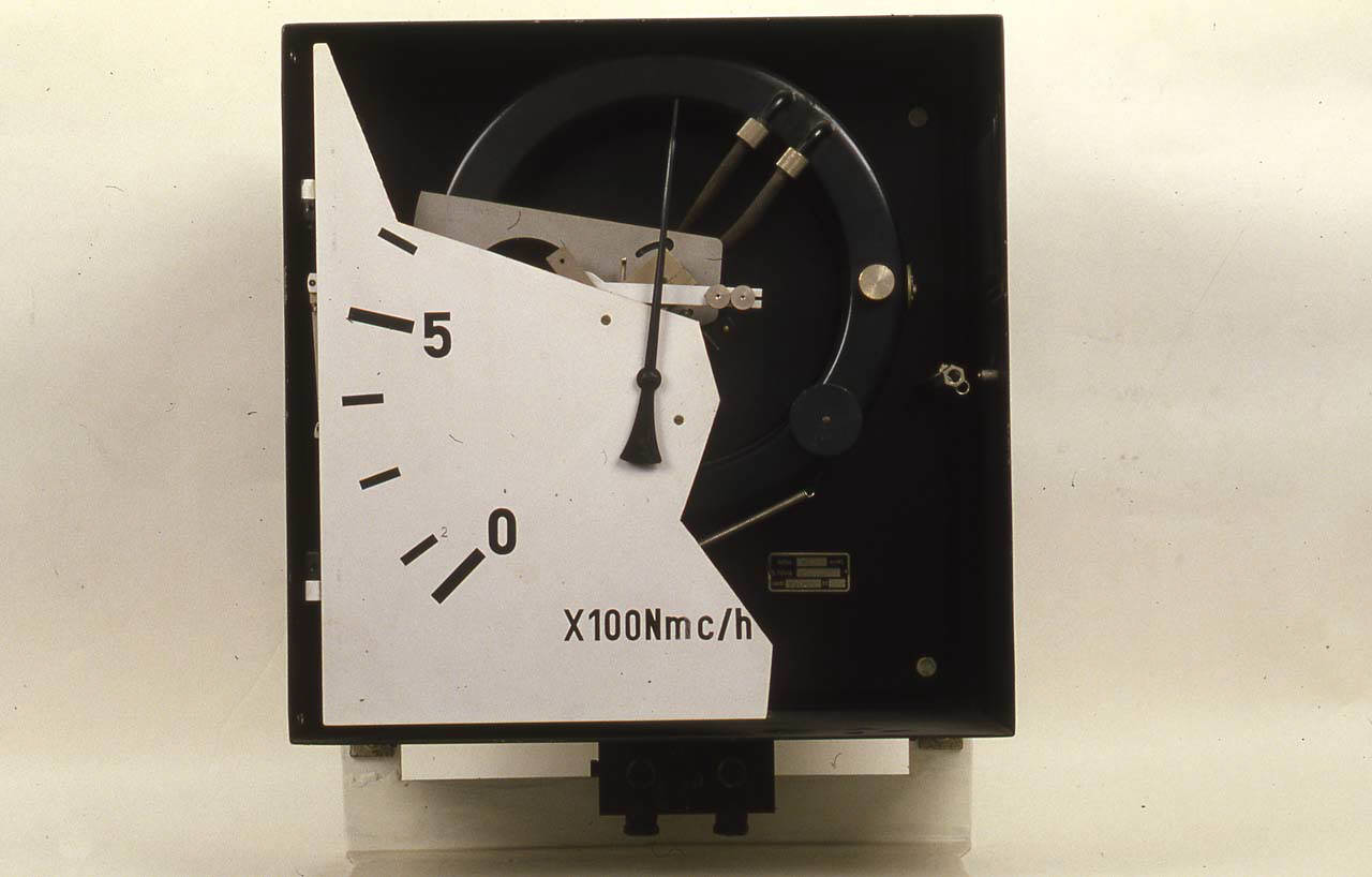 Lo strumento aveva funzione didattico esplicativa. La parte frontale infatti è parzialmente asportata per permettere la visione del meccanismo di funzionamento interno. Lo strumento è di forma quadrata e la parte frontale è completamente occupata dal quadrante di misura che, in questo caso, è per gran parte mancante. All'interno è collocata una camera metallica vuota, di forma cilindrica, alla quale giungono due tubi che trasportano il fluido da misurare. La camera può ruotare liberamente attorno al proprio asse e la posizione viene trasmessa, per mezzo di un sistema di leve, alla lancetta indicatrice. Questa, imperniata nel punto centrale del quadro anteriore, indicava i valori su una scala di forma circolare. Poichè la scala graduata è in gran parte mancante non è possibile sapere i valori che era possibile leggere. L'unità di misura risulta però essere Nmc/h. Sul fondo dello strumento è collocata un'etichetta metallica con i dati fondamentali dello strumento. Nella parte inferiore dello strumento sono presenti i due collegamenti al circuito pneumatico o idraulico. Lo strumento è collocato su un supporto metallico per fini espositivi.