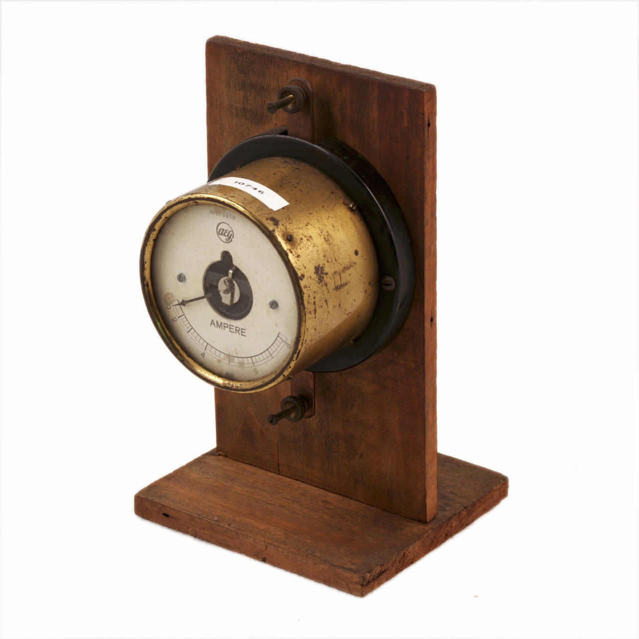 Tipico strumento di misura elettrico di forma circolare, è montato su un supporto in legno per consentirne l'utilizzo in un laboratorio didattico. La struttura principale è sostanzialmente metallica ma una delle superfici circolari dello strumento è in vetro e ricopre e protegge il quadrante. L'indice per la lettura è imperniato al centro del quadrante e scorre su una scala graduata semicircolare posizionata nella parte inferiore del quadrante stesso. La scala permette misure da 2 a 8 Ampere, con indicazioni numeriche ogni 2 unità e tacche ogni 0,2. Sulla base in legno che funge da supporto sono posizionati i due morsetti ai quali collegare gli estremi del circuito da misurare.
