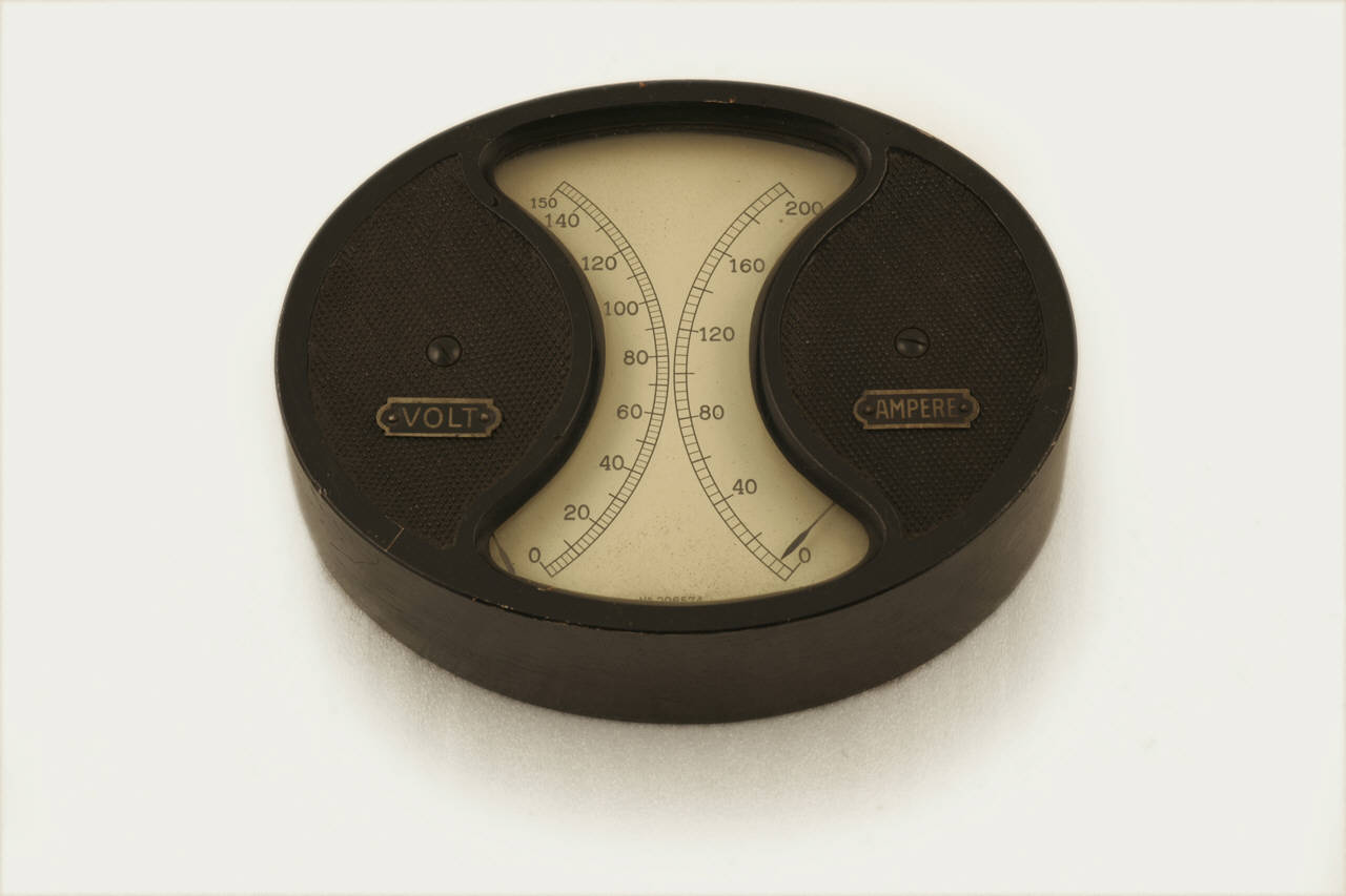 Questo strumento è cilindrico a base ellittica e veniva appeso su di un quadro di controllo, in posizione verticale e con la base maggiore dell'ellisse posizionata orizzontalmente. Lo strumento è quasi interamente in metallo anche nella parte frontale dove è presente una zona a forma di clessidra protetta da vetro e dalla quale è visibile il quadrante sottostante. Sono presenti due scale disposte ad arco di circonferenza ed opposte: quella di sinistra permetteva di misurare differenze di potenziale comprese tra 0 e 150 Volt ed è suddivisa con tacche ogni 2 unità ed indicazione numerica ogni 10, quella di destra misurava invece intensità di corrente comprese tra 0 e 200 Ampere ed è suddivisa con tacche ogni 4 unità ed indicazione numerica ogni 40. Le lancette indicatrici sono imperniate rispettivamente a sinistra e a destra della superficie e ne sono visibili solo le punte in corrispondenza delle scale di lettura. Nella parte posteriore dello strumento sono visibili i fori per il fissaggio al quadro di controllo e i fori per l'ingresso dei fili di collegamento al circuito elettrico da misurare.