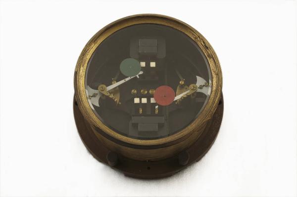 Lo strumento in metallo ha forma cilindrica. Dalla superficie circolare superiore, che è in vetro, è visibile il meccanismo interno di funzionamento costituito sostanzialmente da due bobine e due lancette terminanti l'una con un disco rosso e l'altra con un disco verde (palette), libere alzarsi o abbassarsi a seconda dell'impulso che arrivava alle bobine. Dalla parte opposta alla superficie in vetro, lo strumento termina con una flangia che ne facilitava il bloccaggio su un quadro di controllo generale. Sulla flangia sono presenti cinque connettori per i collegamenti elettrici.