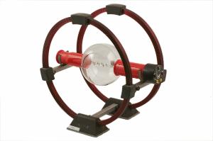 Questo apparato è costituito da due parti: un tubo a raggio filiforme e due bobine di Helmoltz per la produzione di un campo magnetico omogeneo. \nI tubo è costituito da una sfera di vetro nel cui interno è sistemato il cannone elettronico ed è riempito di gas raro a bassa pressione.\nI due raccordi coassiali di vetro del tubo sono ricoperti da cappucci protettivi in plastica e servono per inserire il tubo stesso nella coppia di bobine.\nSu uno dei due cappucci è riportato lo schema elettrico con le varie indicazioni relative al funzionamento e le boccole per i collegamenti elettrici. Sulla'ltro cappuccio una targhetta in metallo riposta il nome dell'azienda costruttrice e il modello dello strumento.\nUn dispositivo di misura munito di tacche fosforescenti all'interno del tubo, permette di stabilire il raggio del cerchio luminoso indipendentemente dall'errore di parallasse.\nLe bobine di Helmoltz sono costituite da due singole bobine ognuna di 154 spire, avvolte su due anelli di raggio 20cm e posti parallelamente, alla distanza di 20cm. Ciascuna bobina è montata su una basetta con boccole di collegamento. La parte inferiore delle basette è rivestita in feltro. Il collegamento coassiale delle due bobine è garantito da tre rotaie due delle quali servono anche a sorreggere il tubo a fascio filiforme.