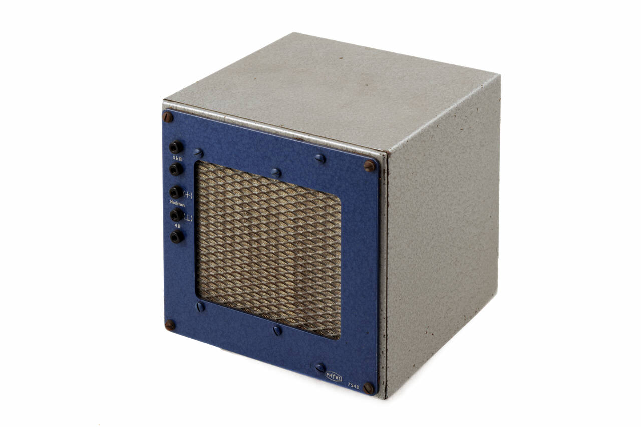 Questo apparecchio è racchiuso in una custodia metallica di forma cubica e poggia su quattro piedini in gomma. \nLa parete frontale è quasi interamente occupata da una griglia in metallo che protegge, unitamente ad una pezza in tessuto, la membrana dell'altoparlante. Di fianco alla griglia, sono inserite due coppie di boccole da 4mm per ingressi di 4Ohm e 5 KOhm.\nLa parete posteriore è parzialmente occupata da una griglia di aerazione che permette anche la visione dell'interno dell'altoparlante.\nL'apparecchio comprende due altoparlanti magnetodinamici con gamme di frequenza 50Hz-12KHz e 7KHz-15KHz.\nSul retro è applicata una targhetta metallica riportante il nome dell'azienda costruttrice ed alcuni dati dello strumento.\nE' mancante il cavetto di accoppiamento con spine per il collegamento con l'amplificatore di bassa frequenza, normalmente in dotazione come accessorio.