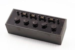 Questa cassetta di resistenze è racchiusa in una custodia in metallo di forma parallelepipeda e poggia su quattro piedini in metallo.\nIl pannello superiore è interamente occupato da coppie di boccole per i collegamenti elettrici delle cinque decadi in linea e manopole di manovra dei commutatori delle stesse.\nCiascuna manopola riporta la numerazione da 0 a 10 e l'indicazione del coefficiente: da sinistra a destra, x 1000, x 100, x 10, x 1, x 0.1.\nLe diverse decadi sono collegate l'una all'altra da quattro lamine metalliche inserite nelle boccole dei connettori (svitando le boccole è possibile asportare le lamine).\nLe manopole di manovra dei commutatori sono collegate con i diversi resistori tarati collocati all'interno della custodia.