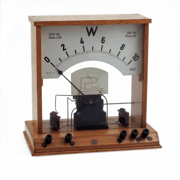 Questo strumento ha scopo prettamente didattico ed è racchiuso in una custodia, di forma parallelepipeda, in legno e vetro che permette la visione del meccanismo di funzionamento.\nAll'interno è visibile lo strumento di misura vero e proprio e i relativi circuiti voltmetrico ed amperometrico.\nLa connessione ai due conduttori di collegamento tra generatore ed utilizzatore sono resi possibili attraverso i morsetti a boccola posti sulla base della custodia.\nLa lancetta indicatrice permette misure su una scala, con zero a sinistra, graduata da 0 a 10 con indicazioni numeriche ogni due unità e tacche ogni 0,2.\nPer segnali da 20V e 5A, i campi di misura variano da 0 a 100W, per segnali da 220V e 5A variano da 0 a 1000W.\nLa scala di lettura è graduata anche sul retro.\nTra la scala di lettura ed il dispositivo è inserita una placca che riporta lo schema elettrico dello strumento.\nSul lato sinistro dello strumento è inserita una vite per la correzione dello zero.