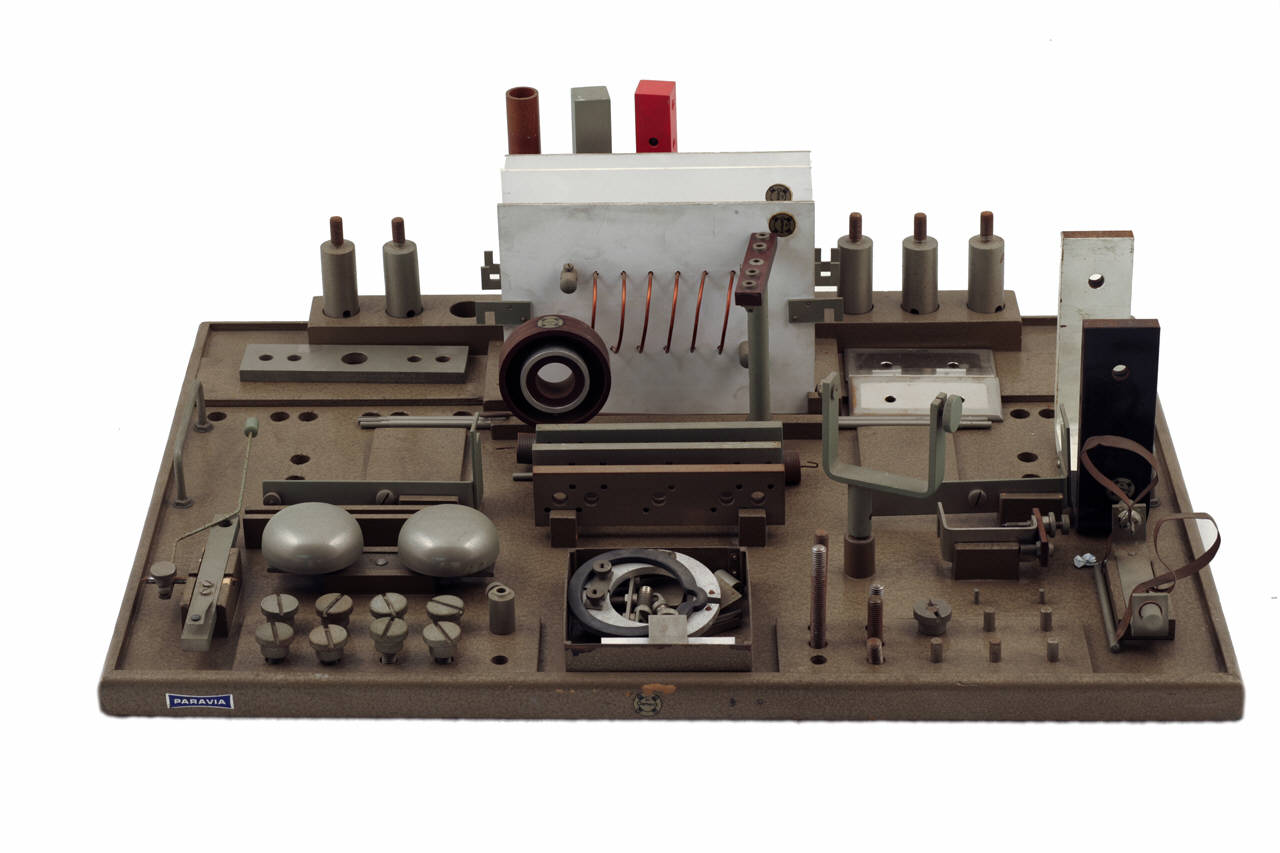 Questo gruppo tecnico contiene una collezione di elementi di montaggio raccolti su un contenitore a vassoio con maniglie.\nMolti dei pezzi originali sono mancanti, ad esempio le bobine.\nSono presenti diversi conduttori elettrici con spinotti a foro trasversale all'estremità, diversi sostegni per costruire i dispositivi didattici, un interruttore, una suoneria di un campanello, un nucleo ad U, tre basette per esperimenti sugli effetti della corrente elettrica (su una è montato un solenoide in rame, le altre presentano dei fori per l'inserzione di conduttori rettilinei)