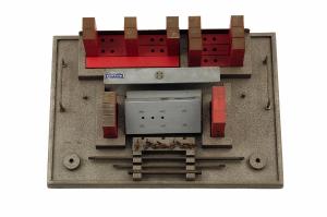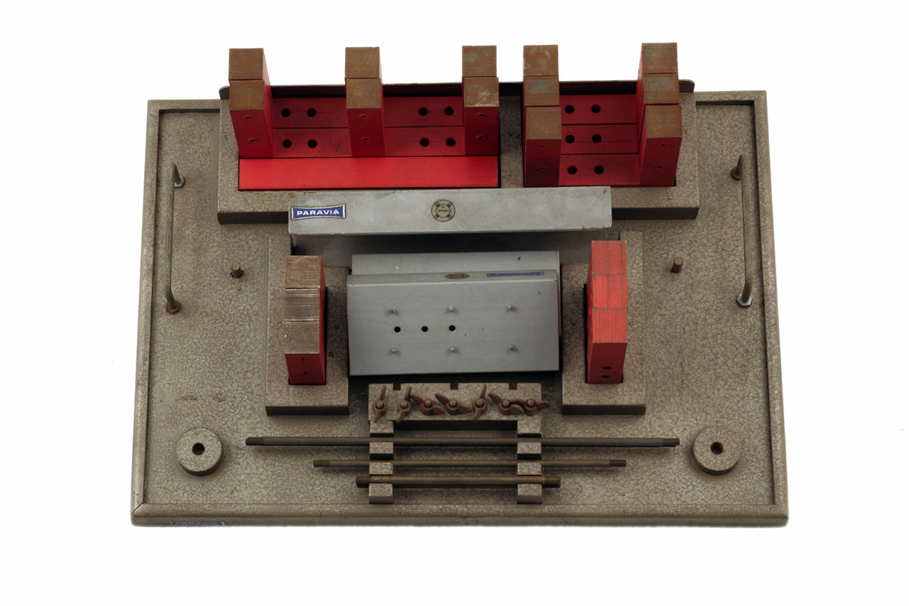 Questo gruppo tecnico contiene una collezione di elementi di montaggio raccolti su un contenitore a vassoio con maniglie.\nSono presenti diverse parti per costruire trasformatori scomponibili di varie tipologie: nuclei ad U, gioghi, perni di fissaggio e basi di sostegno.\nMancano le bobine originariamente in dotazione con il gruppo.