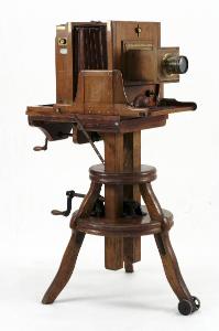 Apparecchio fotografico montato su cavalletto da studio, entrambi prevalentemente realizzati in legno.\nL'apparecchio è costituito da un porta lastre basculante e un portaobiettivo con regolazione orizzontale, collegati attraverso un soffietto in pelle a sezione quadrata. Il soffietto è protetto lateralmente da due supporti in legno detti ali.\nLa distanza lastra-obiettivo poteva essere variata mediante un meccanismo di vite senza fine governato con una manovella posta sul piano d'appoggio dell'apparecchio che faceva scorrere il porta lastra permettendo così la messa a fuoco (messa a fuoco a doppia cremagliera).\nE' mancante la lastra in vetro smerigliato che dovrebbe essere inserita sul porta lastra.\nL'obiettivo, a due lenti, è montato su una piccola cassetta in legno all'interno della quale è inserito un otturatore meccanico a comando pneumatico che viene controllato tramite una pompetta in gomma collegata all'otturatore stesso attraverso una guaina.\nLa guaina è rotta nel punto di raccordo con la pompetta.\nIl cavalletto è a terrazza, a due piani e due colonne che portano la dentiera del meccanismo di regolazione dell'altezza dell'apparecchio, governato mediante una manovella.\nL'inclinazione dell'apparecchio può essere variata mediante un'altra manovella posta sul piano orizzontale superiore del cavalletto.\nUna delle gambe del cavalletto termina con una piccola ruota che facilita lo spostamento della struttura.