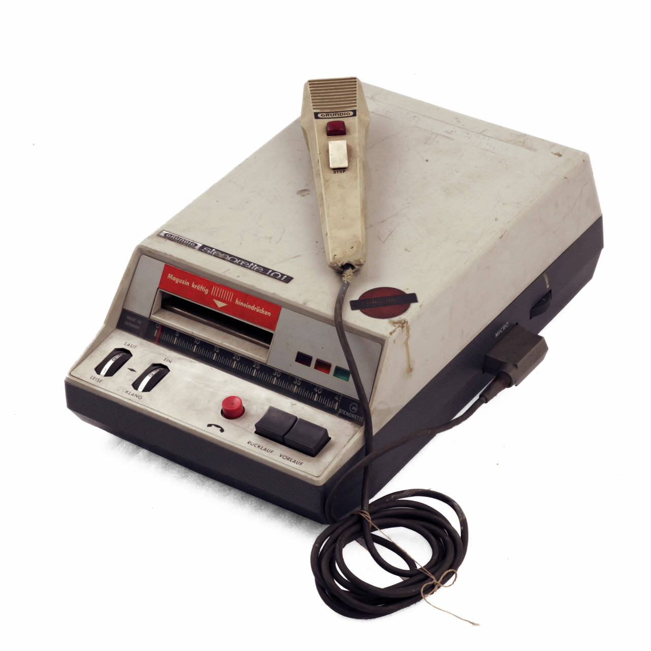 Dittafono a dischi magnetici costituito da uno chassis in plastica bianca e grigia, fissato su un telaio in metallo. I comandi si concentrano sul lato anteriore e consistono in due rotelle per la regolazione del livello di volume e del tono, due pulsanti in plastica grigia per le operazioni di riavvolgimento e scorrimento veloce del disco magnetico, un pulsante in plastica rossa per le registrazioni telefoniche; sono presenti inoltre tre spie luminose e un contaminuti, costituito da una scala graduata da 0 a 45 sulla quale si muove un'asticella rossa. Sul lato anteriore si trova infine la fessura per l'inserimento del disco magnetico. Sul fianco destro dell'apparecchio è posto il supporto per il collegamento del microfono ed un selettore a rotella. Sul lato posteriore sono collocati il supporto bipolare per il cavo di alimentazione e due boccole per la connessione dell'accoppiatore telefonico e per il collegamento del registratore a nastro. Sul lato posteriore e sul fondo si aprono delle prese d'aria per il raffreddamento del motore. Il dittafono è accessoriato con un microfono in plastica bianca, dotato di un pulsante per l'avvio e l'arresto della registrazione e di una spia rossa.