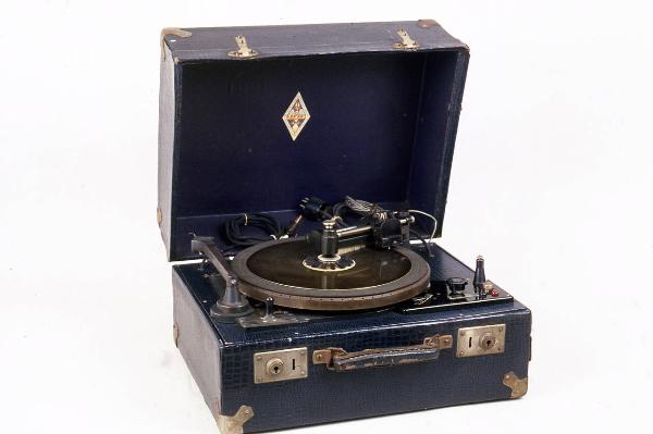 Grammofono incisore contenuto in una valigetta in legno, rivestita di finta pelle di colore blu. All'interno della base della valigetta sono situati il motore elettrico e i circuiti. Il piatto di incisione/riproduzione è posto sul piano superiore, alzabile. Accanto al piatto si trovano i comandi operativi del grammofono: alla sinistra è posto il commutatore della modalità riproduzione/incisione, mentre a destra sono situati il selettore a manopola del segnale in ingresso tra microfono e radio e due boccole per i collegamenti esterni. Sul piano inoltre sono collocati due diversi bracci: alla sinistra del piatto è posto il braccio per la riproduzione dei vinili, mentre alla destra è situato il braccio per l'incisione, sul quale è installata una senza fine che trascina il dispositivo incisore lungo il braccio; sul lato inferiore del braccio incisore è situata una spazzola per la rimozione dei residui dell'incisione. Dalla parte posteriore del piano escono i cavi elettrici per il collegamento alla corrente di alimentazione e al dispositivo di amplificazione. Il grammofono è accessoriato con dischi in vinile vergini, conservati all'interno della basa della valigetta.