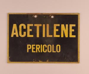 Placchetta rettangolare in alluminio riquadrata, con bordo e scritta in giallo, ottenuti mediante l'utilizzo della verniciatura con mascherina, su fondo nero. Presenta due fori nella parte superiore atti al fissaggio.