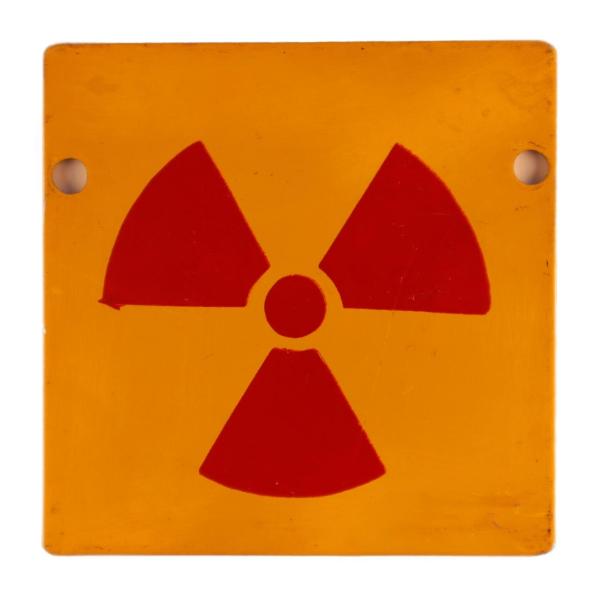 Placchetta quadrata recante su entrambe le facce il simbolo del nucleare, in rosso, su fondo giallo. Presenta due fori laterali atti al fissaggio.