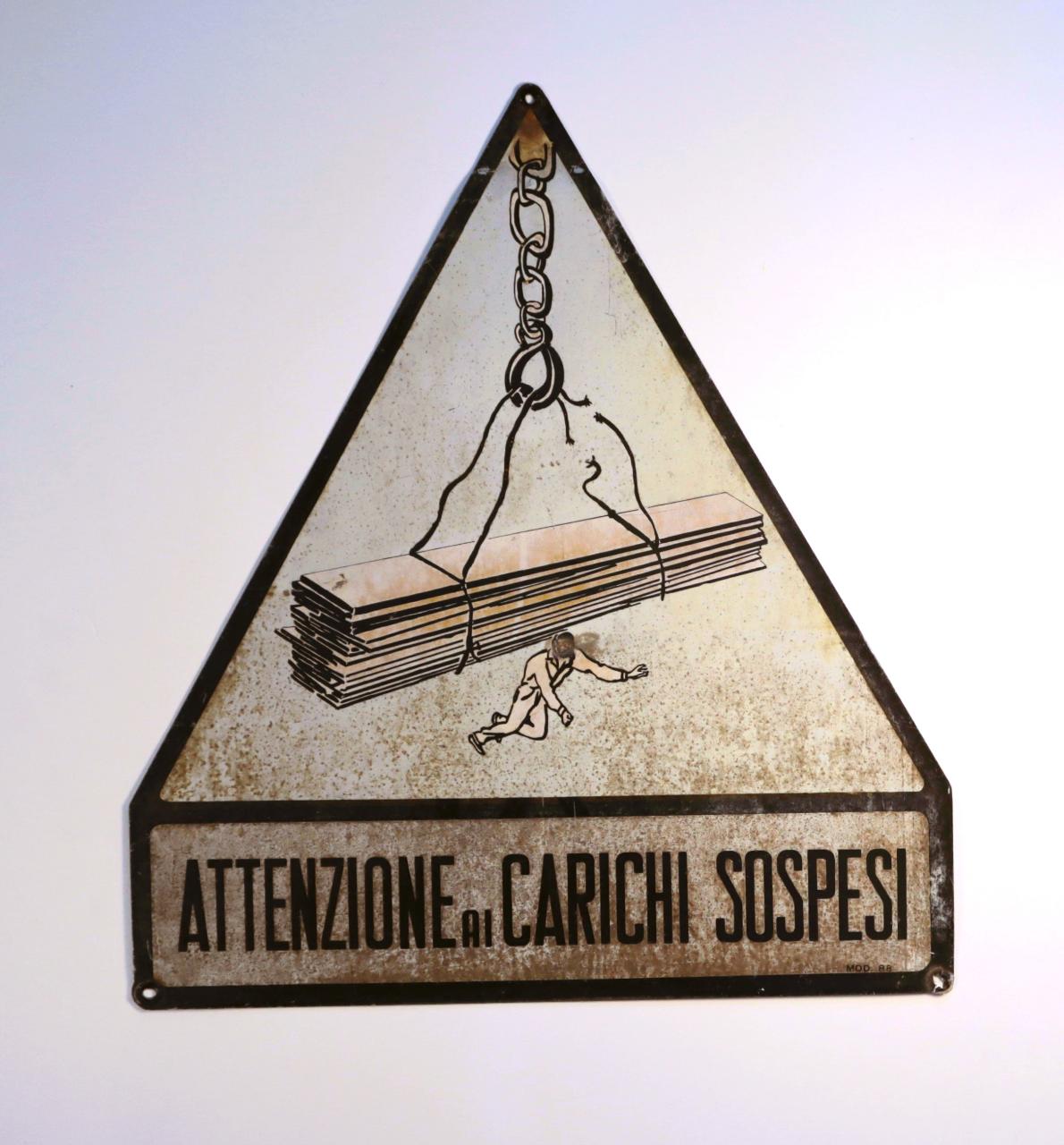 Cartello costituito da una parte triangolare, con illustrazione descrittiva su fondo bianco, e una parte rettangolare recante scritta in nero su fondo bianco, ottenuti mediante l'utilizzo della verniciatura con mascherina e con ritocchi a mano. Presenta tre fori agli angoli atti al fissaggio.\n\n
