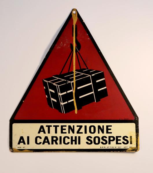Cartello costituito da una parte triangolare, con illustrazione descrittiva su fondo rosso, e una parte rettangolare recante scritta in nero su fondo bianco, ottenuti mediante l'utilizzo della verniciatura con mascherina e con ritocchi a mano. Presenta tre fori agli angoli atti al fissaggio.\n\n \n