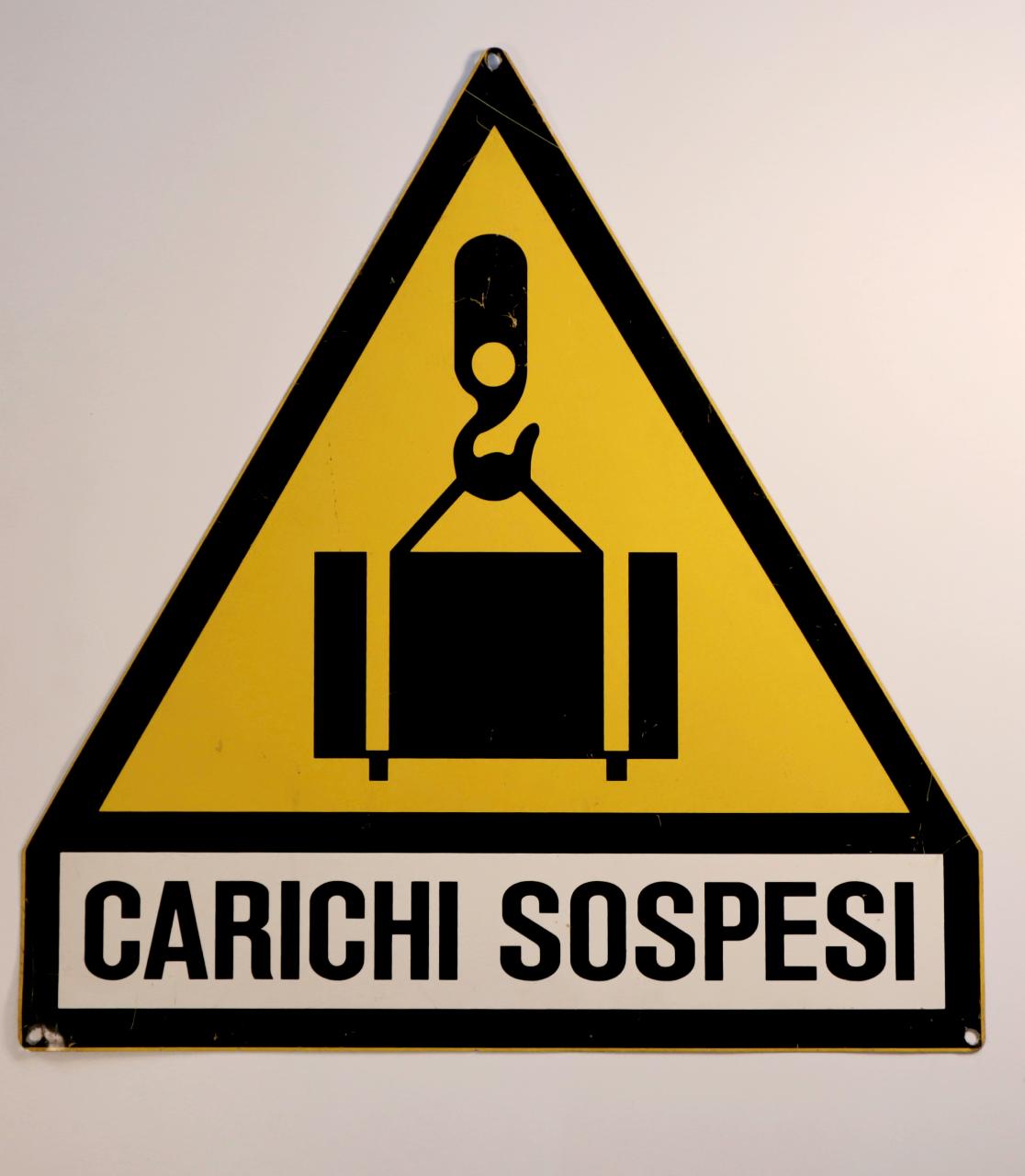Cartello costituito da una parte triangolare, con pittogramma nero su fondo giallo, e una parte rettangolare recante scritta in nero su fondo bianco, ottenuti mediante l'utilizzo della serigrafia. Presenta tre fori agli angoli atti al fissaggio.