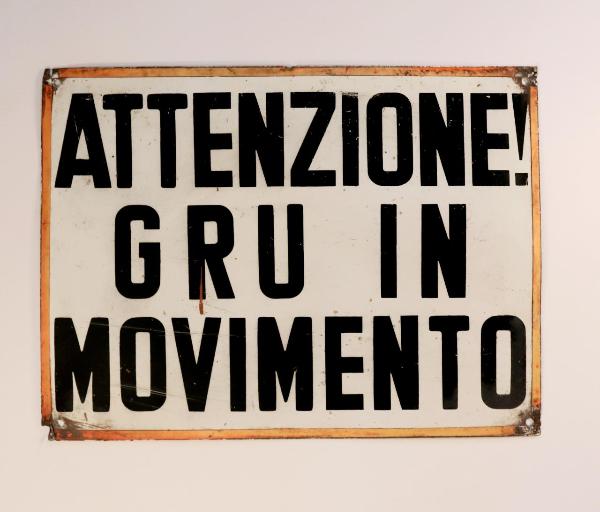 Cartello rettangolare riquadrato con nastro adesivo arancione, recante scritta in nero, ottenuta mediante l'utilizzo della serigrafia, su fondo bianco. Presenta quattro fori agli angoli atti al fissaggio.\n\n