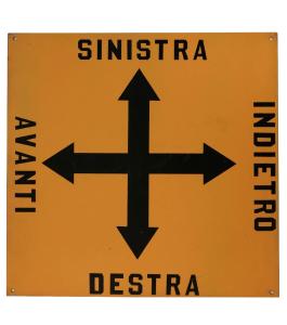 Cartello quadrato, recante un pittogramma (al centro) e delle scritte (sui bordi), ottenuti mediante l'utilizzo della verniciatura con mascherina, su fondo giallo. Presenta quattro fori agli angoli atti al fissaggio.\n\n