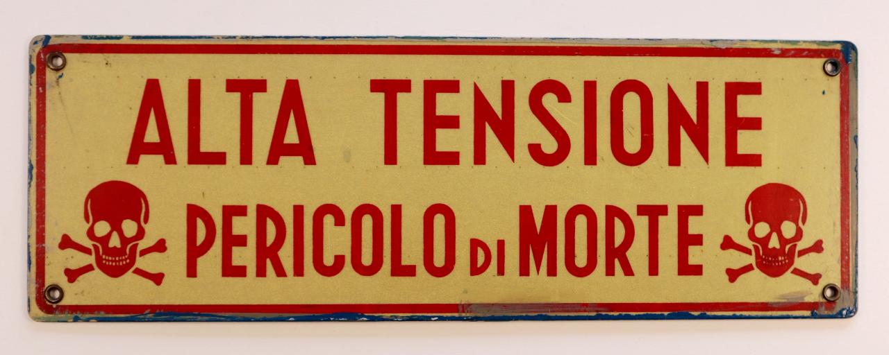 Cartello rettangolare riquadrato, con bordo in rosso, pittogrammi e scritte in rosso, ottenuti mediante l'utilizzo della serigrafia, su fondo bianco. Sono evidenti tracce di altre vernici (blu, grigia) lungo il perimetro. La superficie è ricoperta di vernice trasparente riflettente. Presenta quattro fori agli angoli atti al fissaggio.\n\n