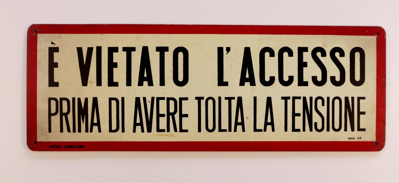 Cartello rettangolare riquadrato, con bordo in rosso e scritta in nero, ottenuta mediante l'utilizzo della serigrafia, su fondo bianco. Presenta quattro fori agli angoli atti al fissaggio.\n\n