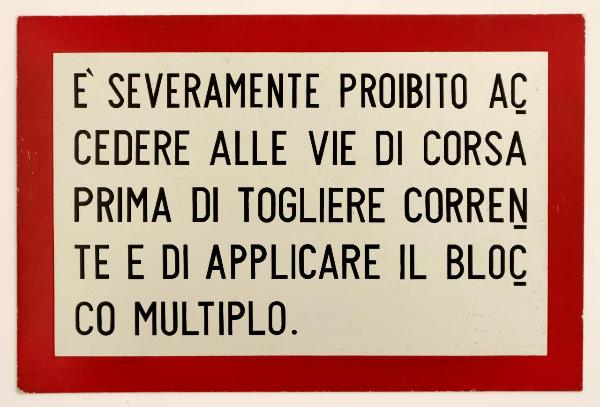 Cartello rettangolare riquadrato, con bordo in rosso e scritta in nero, ottenuti mediante l'utilizzo della serigrafia, su fondo bianco. Presenta quattro fori agli angoli atti al fissaggio.\n
