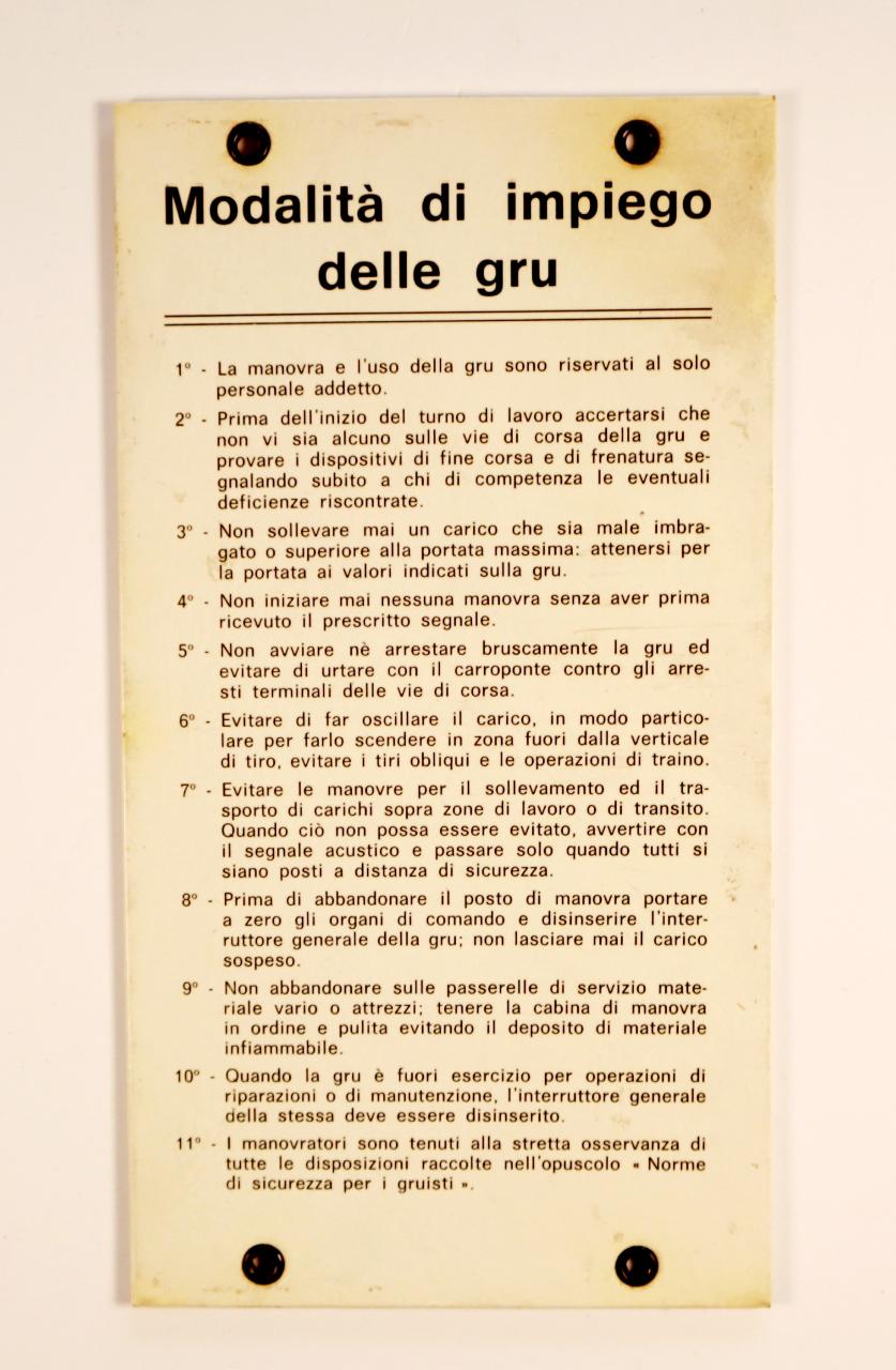 Cartello rettangolare che indica le modalità di utilizzo delle gru attraverso varie disposizioni scritte con inchiostro nero su fondo bianco. Presenta quattro fori in alto e in basso atti al fissaggio.\n\n