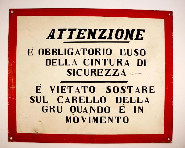 Cartello quadrato riquadrato, con bordo in rosso e scritte in nero, ottenuti mediante l'utilizzo della verniciatura con mascherina, su fondo bianco. Presenta quattro fori agli angoli atti al fissaggio. \n\n\n\n