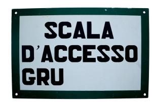 Cartello rettangolare riquadrato, con bordo in verde e scritta in nero, ottenuti mediante l'utilizzo della verniciatura con mascherina, su fondo bianco. Presenta quattro fori agli angoli atti al fissaggio.