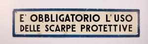 Cartello rettangolare riquadrato, con bordo in blu e scritta in nero, ottenuti mediante l'utilizzo della serigrafia, su fondo bianco. Presenta quattro fori negli angoli atti al fissaggio.\n