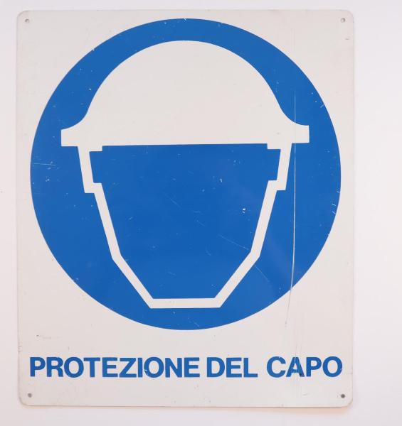 Cartello rettangolare con pittogramma in bianco su fondo circolare blu, e scritta blu su fondo bianco, ottenuti mediante l'utilizzo della serigrafia. Presenta quattro fori negli angoli atti al fissaggio.\n