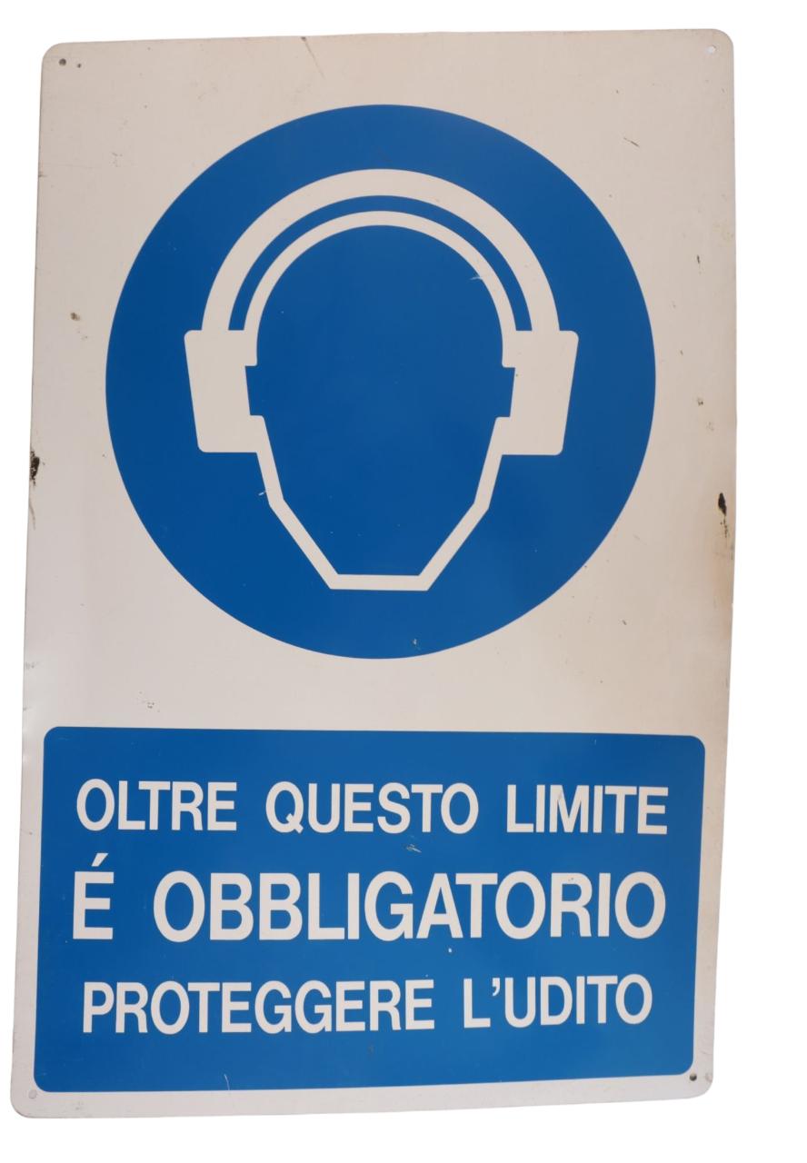 Cartello rettangolare, suddiviso in due campi, recante un pittogramma in bianco su fondo circolare blu (parte superiore) e una scritta in bianco su campo blu (parte inferiore), ottenuti mediante l'utilizzo della serigrafia. Presenta quattro fori negli angoli atti al fissaggio.\n