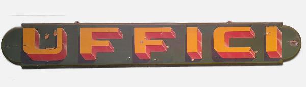 Cartello rettangolare, recante scritta in giallo, ottenuta mediante l'utilizzo della verniciatura con mascherina, su fondo verde. Presenta due ganci nella parte superiore atti al fissaggio.\n\n