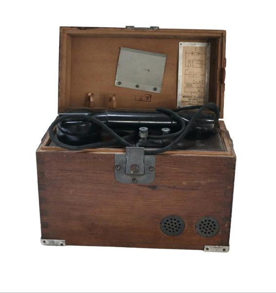 Telefono campale, prova linee, a batteria locale, contenuto in un involucro di legno rigido munito di coperchio e con ricevitore all'interno.