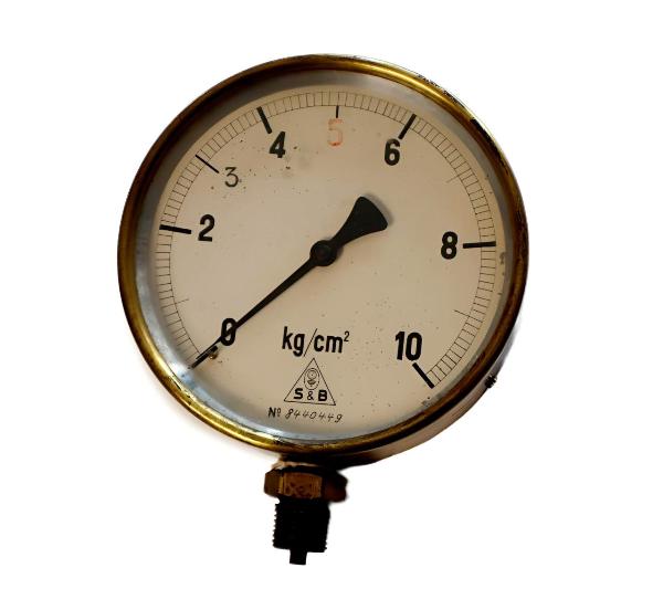 Strumento atto alla misurazione della pressione di forma circolare e dotato di un ago indicante da 0 a 10 kg/cm2.\n