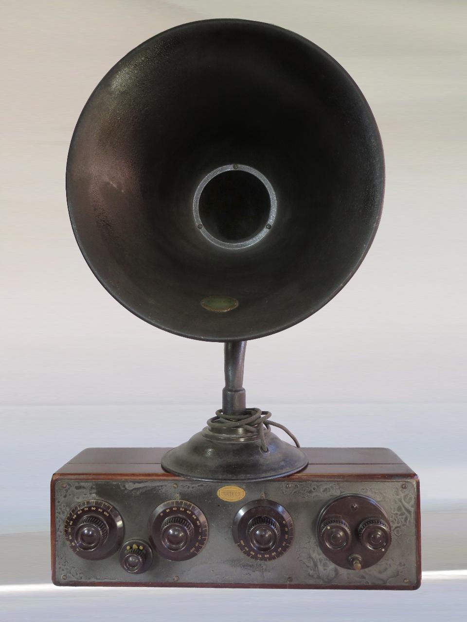Apparecchio radio da tavolo con cassetta in legno apribile e altoparlante esterno in metallo a collo di cigno. Lungo la parete frontale, ricoperta da una lastra in metallo, troviamo a sinistra due sintonizzatori collegati ai circuiti interni con in mezzo una piccola manopola che funziona da interruttore per l'antenna; a destra si trova il terzo sintonizzatore e i comandi di due reostati, collegati internamente con due e tre valvole rispettivamente per controllare le tensioni dei filamenti. In mezzo alla manopola dei reostati è presente l'interruttore di accensione/spegnimento.\nAprendo il coperchio sono visibili le 5 valvole e i tre circuiti accordati (ad amplificazione diretta) senza reazione, in modulazione di ampiezza (AM). Le tre scale graduate relative ai sintonizzatori riportano valori da 0 a 100 con indicazione delle unità. Sul retro sono presenti le boccole per i collegamenti di antenna, batterie, cuffie o amplificatori esterni e messa a terra.\nSul pannello posteriore sono presenti boccole per il collegamento a terra, di un'antenna e dell'altoparlante.\nL'altoparlante in metallo è costituito da due parti: motore e tromba. Il motore è nelle base ed è costituito da un magnete permanente, una bobina e una membrana vibrante, dalla base esce anche il cavo di collegamento al radioricevitore. La tromba è costituita da una gola e una bocca ed ha la caratteristica forma “a collo di cigno”.