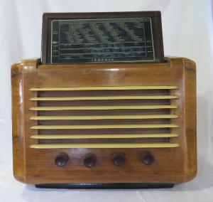 Apparecchio radio soprammobile di forma trapezoidale ad andamento orizzontale con mobile in legno e bordi arrotondati.\nLa parte parete frontale è occupata dall'altoparlante dinamico ellittico coperto da un tessuto e da aste a persiana in legno. Sotto all'altoparlante quattro manopole in bachelite permettono accensione/spegnimento/regolazione volume, sintonizzazione e cambio gamma.\nSulla parte superiore del mobile è inserita una scala parlante reclinabile a scomparsa in vetro e con indice scorrevole. Sulla scala sono presenti quattro scale lineari con indicate le lunghezze d'onda e le località e una finestrella che indica la gamma d'onda selezionata.\nSul retro, sotto ad un pannello protettivo, è visibile il circuito supereterodina ZF/IF 450 kHz, a 5 valvole con circuiti in modulazione di ampiezza (AM). Sul retro sono presenti le presa per antenna e terra, una presa fono, il cavo di alimentazione.