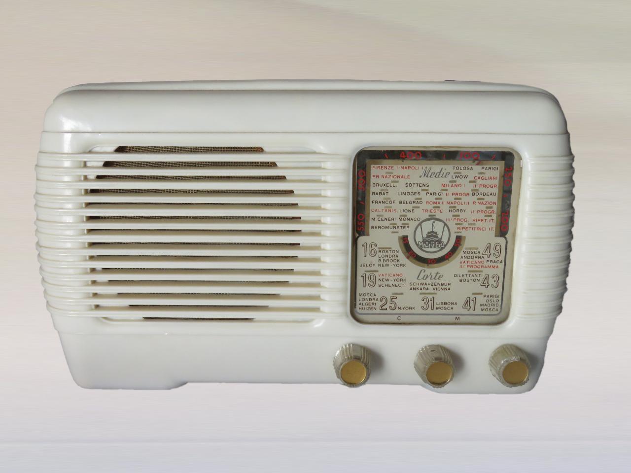 Apparecchio radio compatto ad andamento orizzontale con mobile in materiale plastico bianco con griglia orizzontale lungo tutto l'apparecchio. La parete frontale è divisa in due parti: a sinistra è inserito l'altoparlante magnetodinamico circolare, a destra la scala parlante su vetro a indice ruotante con indicazione delle lunghezze d'onda e delle località.\nSotto alla scala sono presenti tre manopole per accensione/spegnimento/regolazione volume, cambio di gamma d'onda e sintonizzazione.\nIl retro è parzialmente forato per permettere l'aerazione e dietro è visibile il circuito supereterodina a 5 valvole con circuiti in modulazione di ampiezza (AM). \nSul retro sono presenti antenna, cavo di alimentazione, cambiatensione.