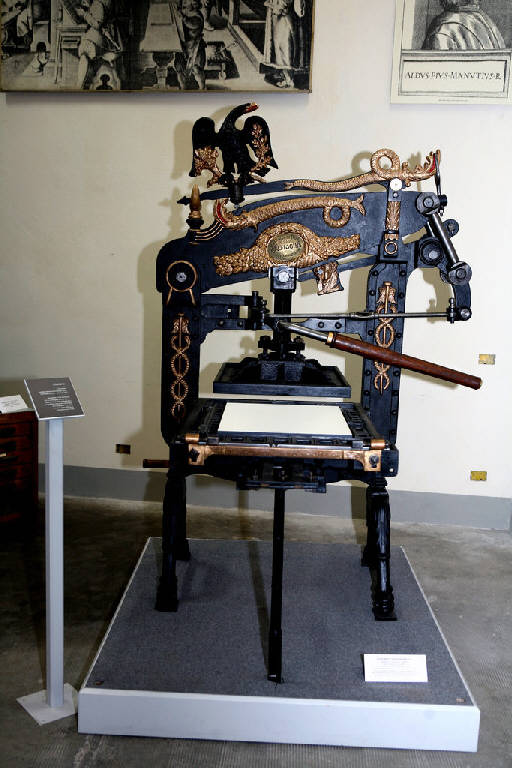 Torchio Tipografico "Columbian" 1859\nInventato dall'americano George Clymer è stato prodotto a Londra a partire dal 1817.\nVenduto fino al 1893 dalla fonderia Figghins. Fusione di ghisa con decorazioni e contrappeso a forma di aquila.\nI meccanismi introdotti rappresentano un'importante innovazione tecnologica.