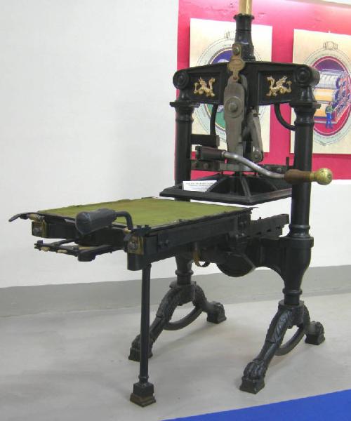 Torchio tipografico Albion "F.lli Dell'Orto".\nFusione in ghisa\nMovimento del carro a cremagliera.\nAnno 1872